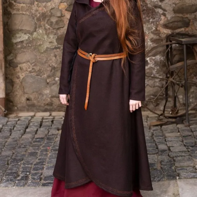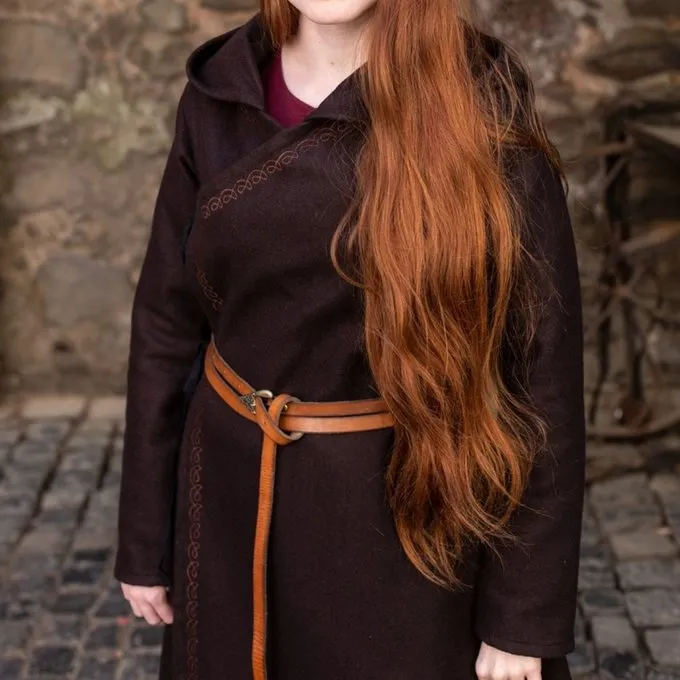 Un vêtement parfait pour la reconstitution historique, le GN, le cosplay et les festivals. Ce beau manteau chaud en laine peut être porté sur n’importe quel vêtement comme protection contre le froid et les intempéries, mais il s’agit également d’une belle addition à votre tenue. La hotte a une capuche de longueur moyenne faite d’après des modèles médiévaux. La cape n’a pas de boutons, mais peut être fixée à l’aide d’une ceinture (non fournie) ou d’un cordon autour de la taille. De cette façon, vous pouvez également personnaliser votre tenue. La cape a un aspect luxueusement coûteux en raison de la matière et des motifs celtiques sur les bords brodés avec un fil imitant le fil d’or. Cette cape en feutre de laine est idéale pour les journées froides. Le matériau est durable, résistant au vent et à l’eau.
