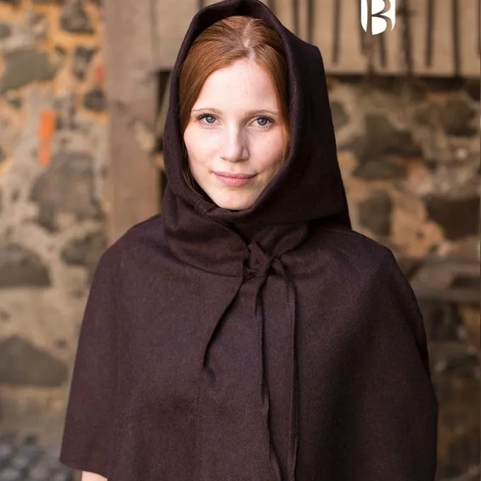 Ce chaperon est basé sur un original représenté dans un livre médiéval des heures (livre de prière quotidien) d’env. 1350 dans la collection de la British Library. Chaperons comme celui-ci étaient portés dans toute l’Europe. Ils protègent la tête et le visage du froid et de la pluie. Les illuminations manuscrites montrent que ce chaperon était même utilisé pour l’apiculture! Ce chaperon se termine par un long point sur le dos.