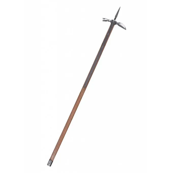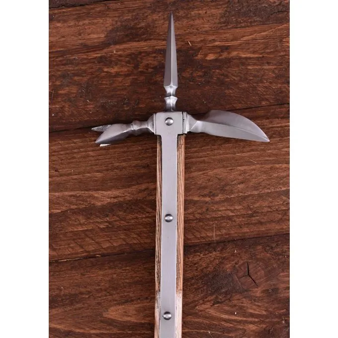 Cette hache pôle est une réplique de plusieurs originaux qui ont été utilisés à l’époque de la Guerre des Roses. La hache pôle était l’arme parfaite pour briser l’armure de plaque. En conséquence, il a été utilisé intensivement pendant un à un combat. Cette hache pôle a plusieurs conseils et une casquette de bout à bout. Lorsque cette hache émoussée pôle est prêt au combat.