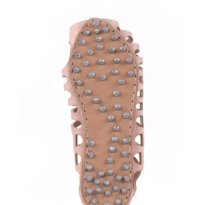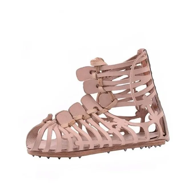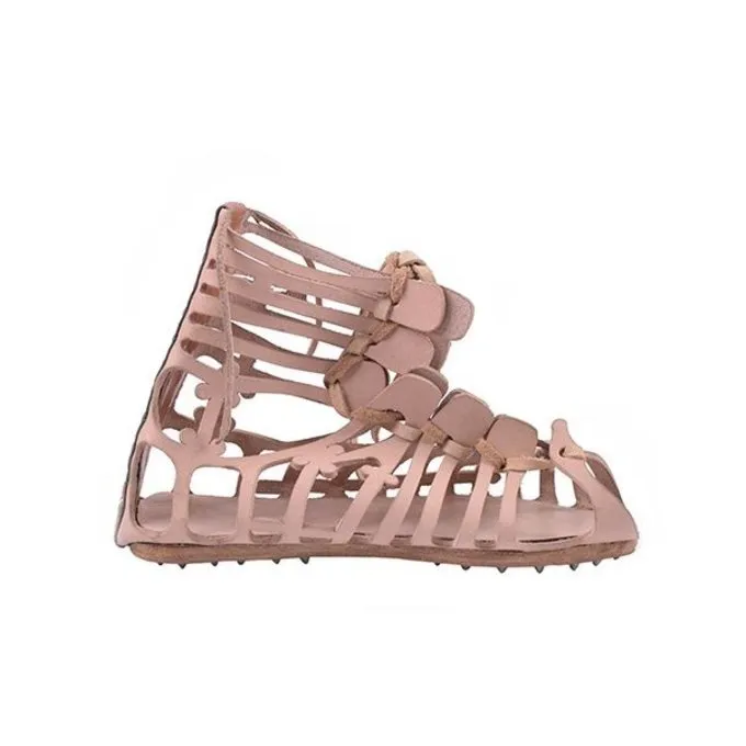 Roman Caligae avec des clous. Ce modèle est basé sur la caligae trouvé à Castleford – Go et Valkenburg – NL. Ce fut la chaussure utilisée par des légionnaires romains. Les semelles sont 7 mm de longs ongles de fer. Les sandales sont faites de cuir tanné naturellement. La couleur est plutôt brun clair. Dans tailles 39 à 45 sont disponibles.