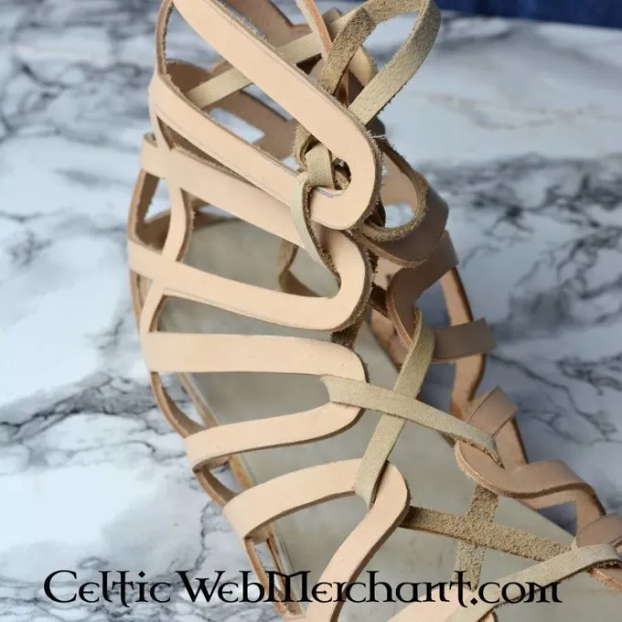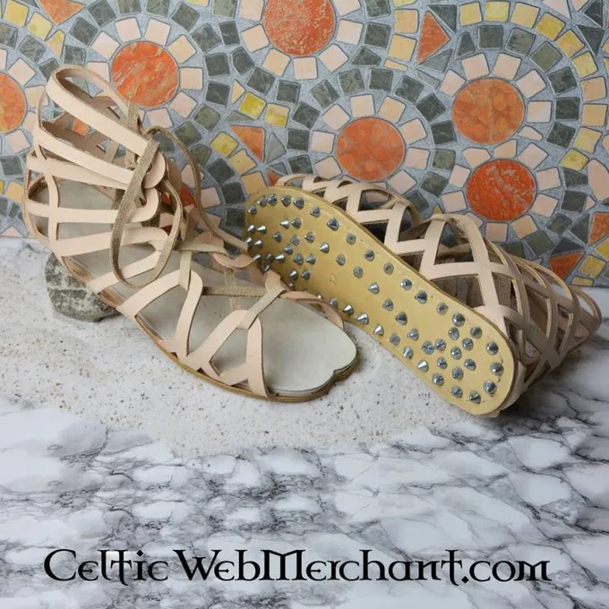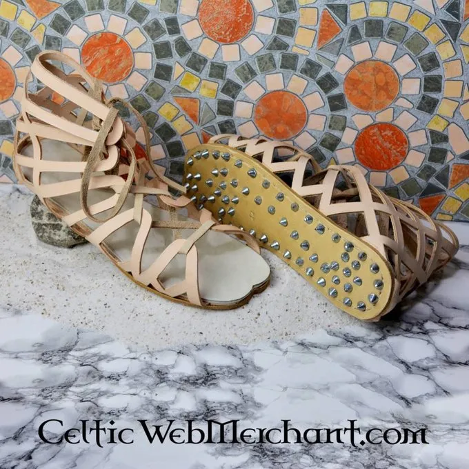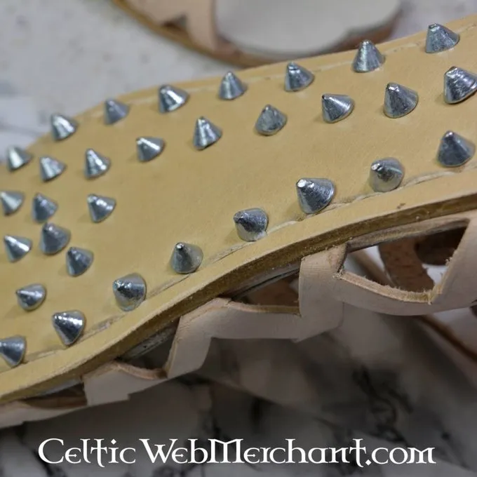 Ces sandales grecques sont faites de 2 mm d’épaisseur de peau de vache et trois couches de semelles épaisses. Ils sont entièrement à la main et muni de clous au fond.