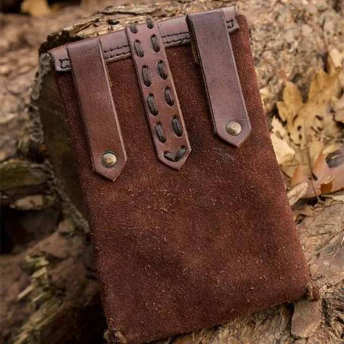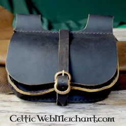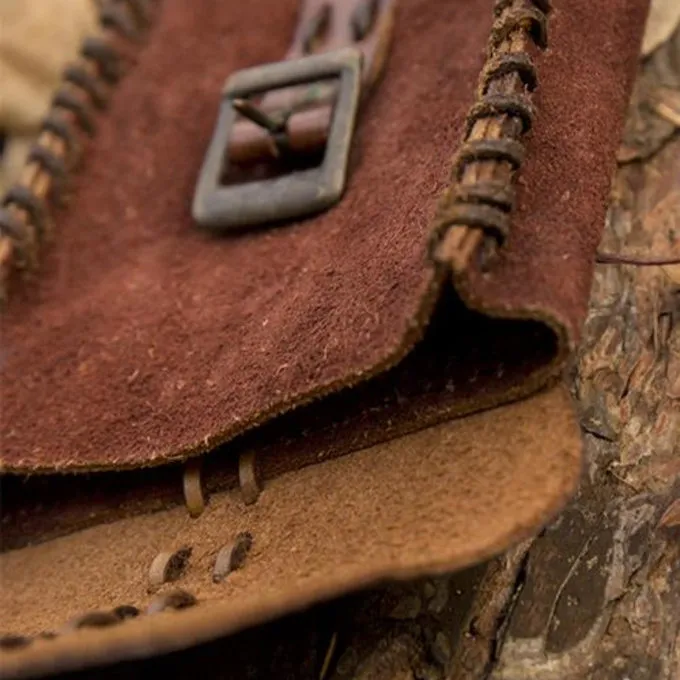 Cette pochette a un beau design et convient à divers personnages de GN et de Cosplay. Par exemple, pour les pirates, les assassins, les commerçants, etc. La pochette est en cuir suède souple et le rabat et la sangle sont en cuir robuste. Il a des détails cousus à la main, le rabat et le côté de la pochette sont cousus avec une épaisse dentelle de cuir. La pochette a un look authentique qui conviendra à de nombreux personnages. Il a des boucles sur le dos afin que vous puissiez l’accrocher à votre ceinture. Vous pouvez fermer le sac avec la boucle en laiton sur le devant.
