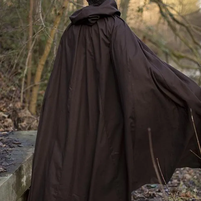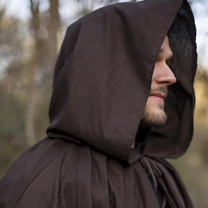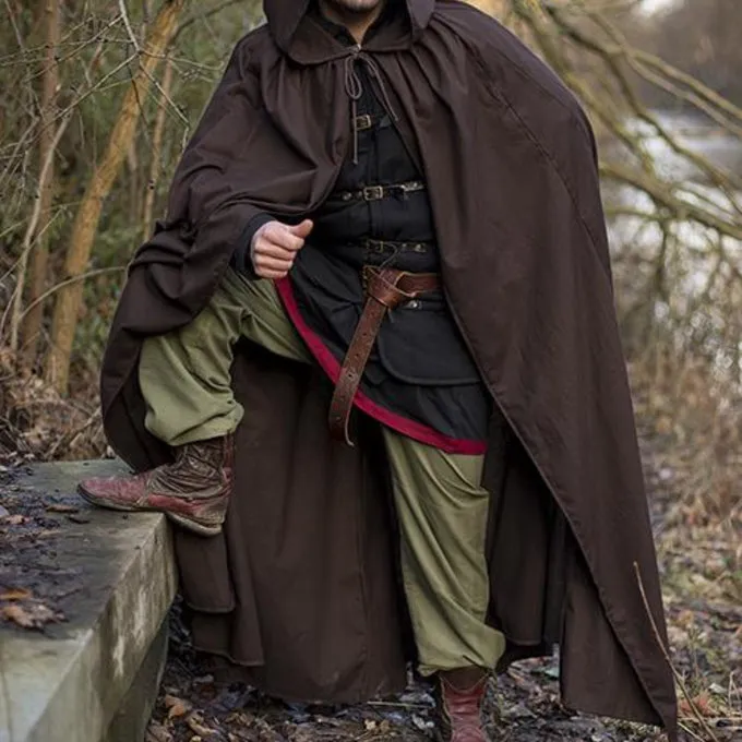 Ce manteau est un modèle universel qui a été porté du début du Moyen Âge à la Renaissance. Il atteint presque les chevilles, a une cagoule et peut être attaché avec des lacets en coton. La cape est en coton et offre une protection contre les éléments tout en restant légère, rapide et maniable grâce à sa légèreté. Un vêtement pratique pour la reconstitution, LARP & Cosplay.