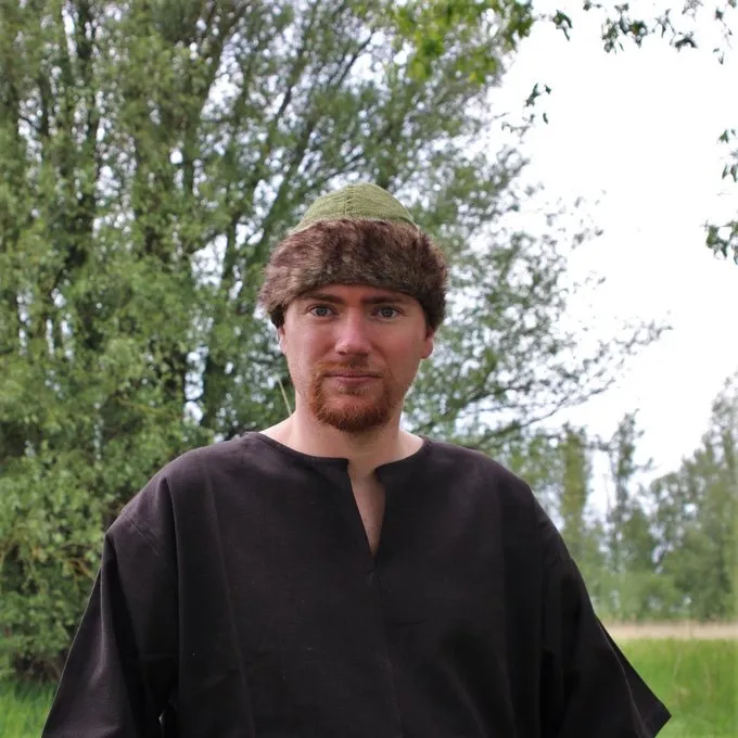 Ce chapeau de Viking est basé sur plusieurs excavations et représentations archéologiques. Des chapeaux comme celui-ci étaient portés partout dans le monde viking, parfois ils se terminaient par un conseil qui pouvait être décoré.