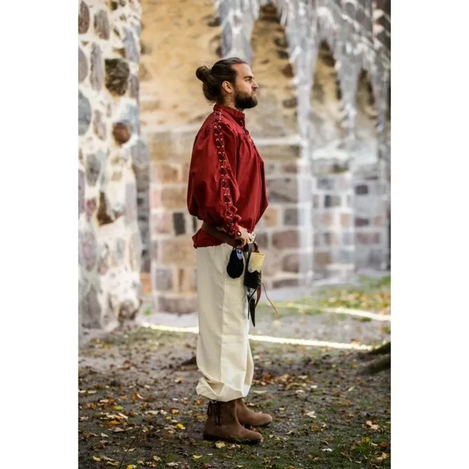 Cette chemise pratique convient à porter séparément ou sous un doublet ou un gilet. Il a des lacets pour un look authentique. La chemise est disponible dans les couleurs noir, rouge, marron et vert.
