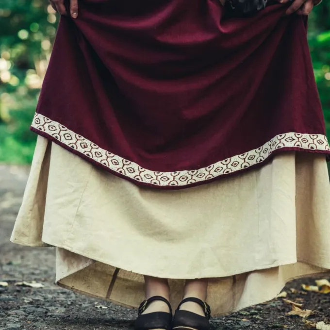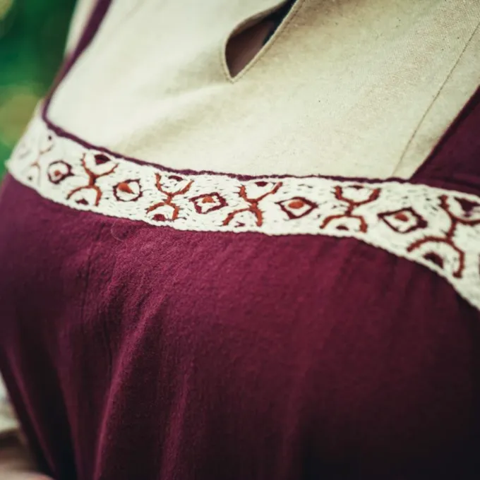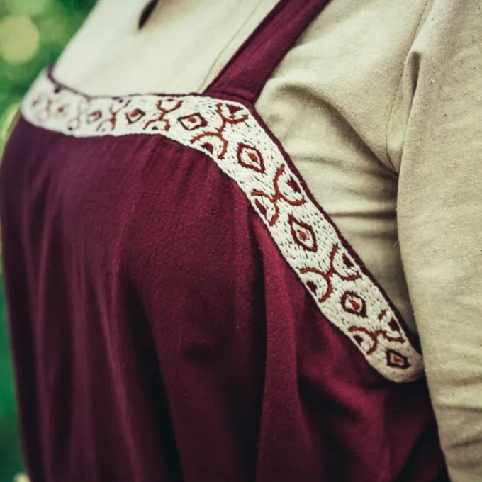 Le hangeroc était un type de vêtement que les vikings et d’autres cultures européennes du haut Moyen Age portaient par-dessus une robe de soirée. Les femmes combinaient une robe de slip et un cintre qui contrastaient dans les couleurs, comme le naturel et le rouge par exemple, ou le jaune avec le vert. Les dames portaient également des perles colorées reliées par deux broches de tortue. Avec leurs vêtements et leurs accessoires, les femmes vikings portaient une belle palette de couleurs contrastantes et montraient leur richesse à travers leurs accessoires et le type de couleurs qu’elles étaient. La robe antidérapante devait aussi toujours apparaître au-dessus de la hangeroc pour accentuer le contraste des couleurs. Les femmes portaient également une ceinture par-dessus le hangeroc sur laquelle elles pouvaient suspendre des objets utiles pour un usage quotidien comme des clés, une pochette avec de l’argent, un couteau, etc. Le haut et le bas de ce luxueux hangeroc sont finis avec une belle bande qui montre un tissage décoratif modèle. Vous pouvez mettre le hangeroc sur votre tête et le fermer avec les lacets sur le côté.