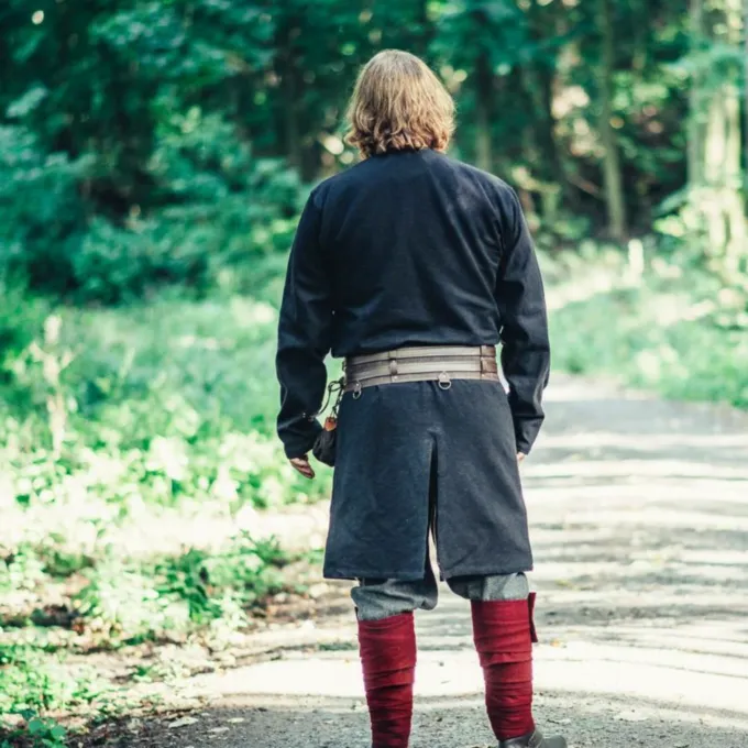 Cette tunique est basée sur des vêtements portés au début du Moyen Âge par les Vikings et d’autres peuples du nord-ouest de l’Europe. Il convient également à la reconstitution médiévale en raison de sa conception universelle. Vous pouvez porter la tunique sur elle-même ou la combiner avec un sous-vêtements par temps froid. Cette longue tunique viking atteint les genoux. Elle présente un col en V et une fente à l’avant et à l’arrière pour un confort ultime lors des batailles, etc. Vous pouvez associer la tunique à une ceinture pour un meilleur ajustement ou raccourcir la tunique avec une ceinture en drapant une partie de la tissu dessus. Au début du Moyen Âge, toutes sortes d’objets étaient portés à la ceinture, tels que des sacs, des couteaux, des haches, etc.