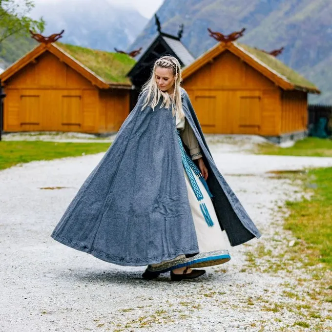 Cette cape de laine mélangée a de beaux bords décoratifs brodés et convient à la reconstitution et au GN. Le tissu lourd est légèrement résistant à l’eau et chaud pour les mois d’hiver. La cape peut être attachée avec une belle fibule en forme de spirale avec la tête de dragon.