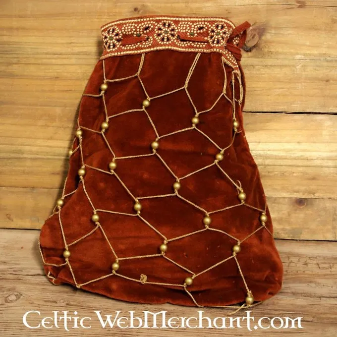 Cette pochette luxueuse peut être utilisée pour la reconstitution médiévale et Renaissance. Il complète une noble, une tenue aristocratique ou royale. Le tissu velouté de la poche est décoré d’un motif de fil d’imitation d’or et de perles d’imitation. Il est fini par le bord supérieur joliment décoré, ressemblant à une tapisserie luxueuse.