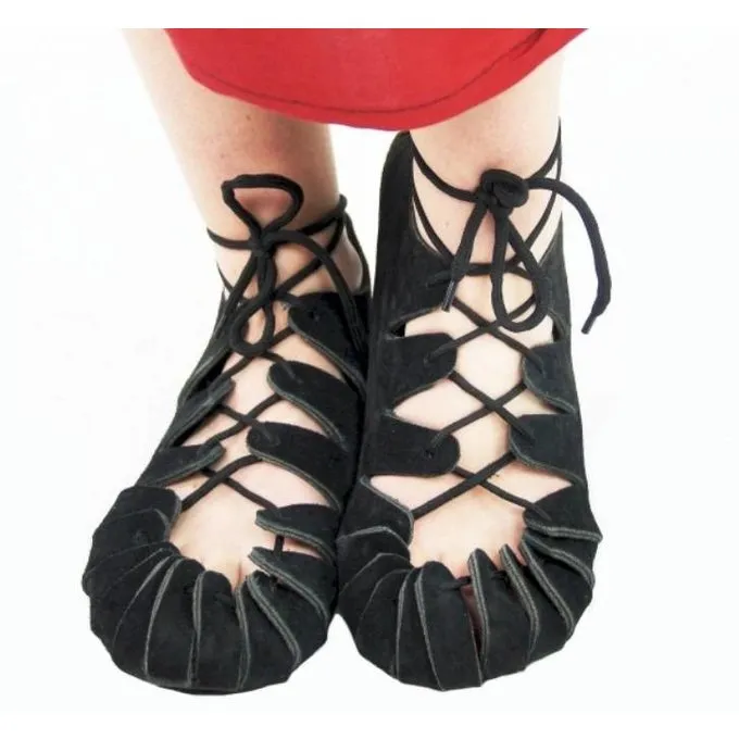 Ces sandales pour enfants sans âge ont été portées de l’âge de pierre jusqu’à l’Antiquité classique au début du Moyen Age et peut-être même plus tard. Un certain nombre d’originaux de ce type ont été fouillés, parmi lesquels un original médiéval du début de l’Irlande. Ces sandales sont faites de cuir suédé et ont une semelle en caoutchouc comme une protection supplémentaire de glisser. .
