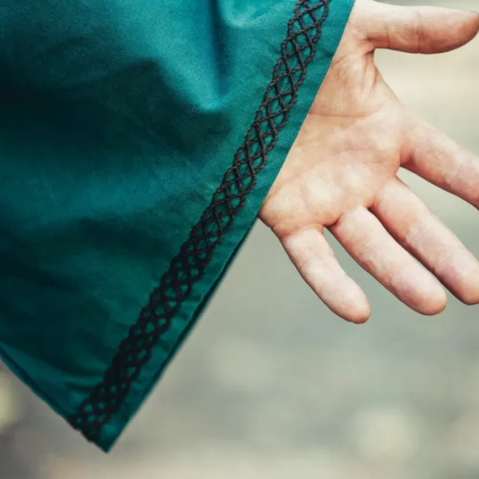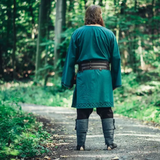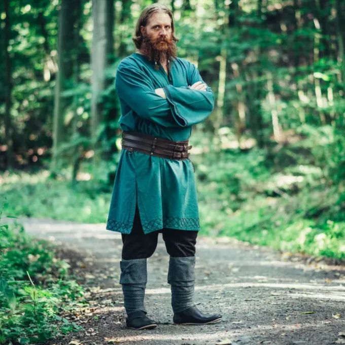 Cette belle tunique convient à la reconstitution, au GN et au cosplay du haut Moyen Âge. Par exemple, les peuples germaniques, les vikings, les anglo-saxons et les normands. Il atteint presque les genoux et le bord inférieur est orné d’un motif brodé. La couleur de la tunique faisait référence au statut social du porteur. Les couleurs telles que le rouge, le bleu et le violet étaient très luxueuses et coûteuses à fabriquer. Les couleurs telles que le marron, le jaune, l’orange, le vert et autres étaient pour l’homme du peuple. Les pigments avec lesquels ces couleurs sont produites sont moins chers et plus faciles à trouver dans la nature. Les guerriers, les paysans et d’autres personnes normales portaient une tunique à la hauteur du genou afin que ce ne soit pas leur travail quotidien. La noblesse portait des tuniques au sol, elle devait naturellement moins bouger pendant la journée, la longueur de son vêtement était un symbole de statut.
