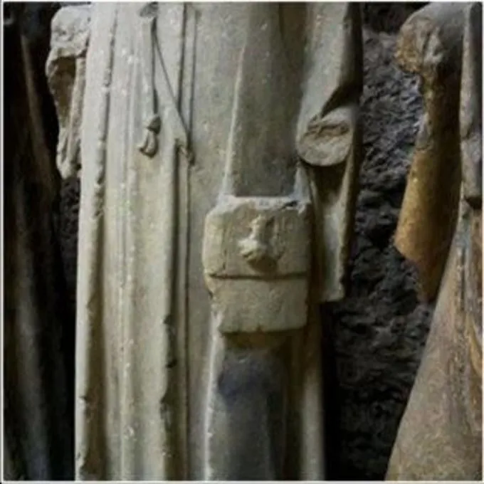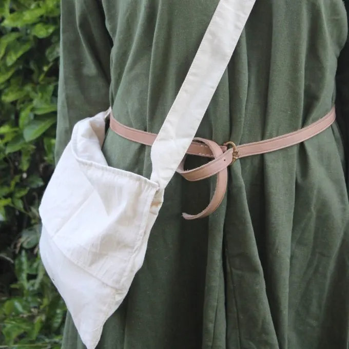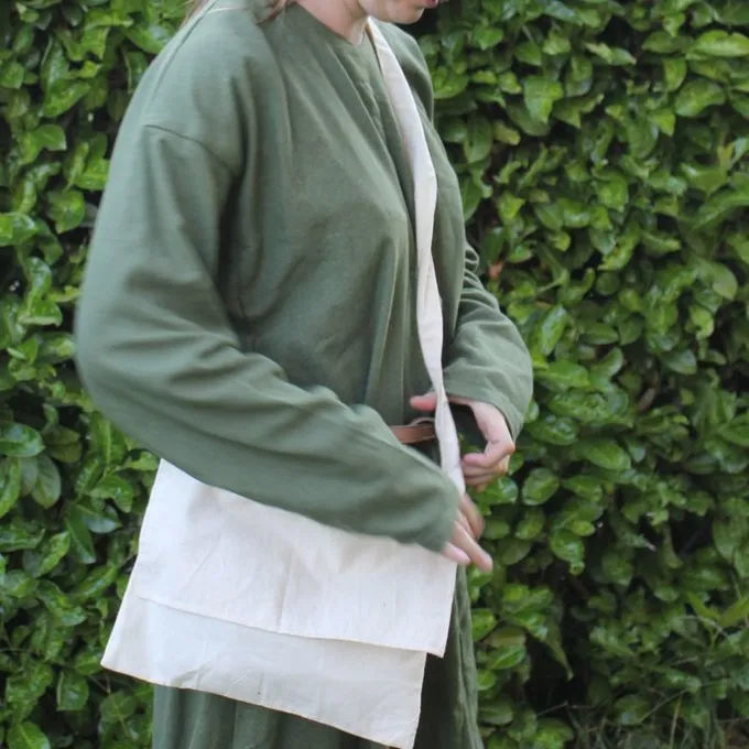 Ce sac est une réplique d’un sac de pèlerins représenté dans la cathédrale de Valence, en Espagne. Il est fabriqué en toile de coton et mesure 28 x 31,5 cm.