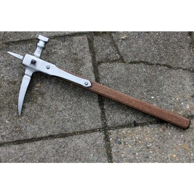 Le marteau de guerre à pointe extra longue a une longueur de 56 cm et la tête de marteau mesure 22,5 x 12 cm. Il a une poignée en bois dur et est entièrement fait à la main. Il pèse env. 0,9 kg.
