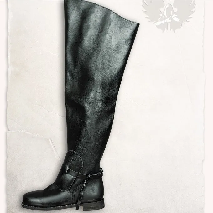 Ces bottes Mytholon de haute qualité sont indispensables pour la reconstitution, le GN et le cosplay des mousquetaires et autres personnages des 17e et 18e siècles. Par exemple, ce sont également d’excellentes bottes d’équitation historiques et vous pouvez les porter avec un costume de votre choix. Les bottes sont hautes et viennent jusqu’aux genoux. Les jambes sont maintenues au chaud lors de longues épreuves. Le cuir est de haute qualité et si vous traitez régulièrement les bottes avec de la cire d’abeille ou du Ballistol, elles sont imperméables. Les bottes ont une sangle à la cheville pour la rendre plus serrée. Le devant de la botte est complètement dans le style du 17ème siècle. Ce sont donc des bottes durables qui durent longtemps et peuvent être combinées avec de nombreux costumes différents.