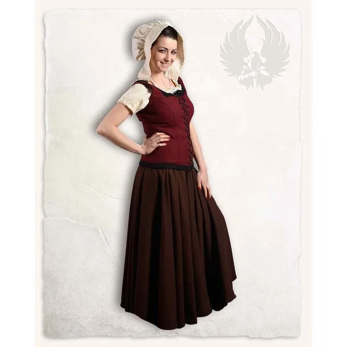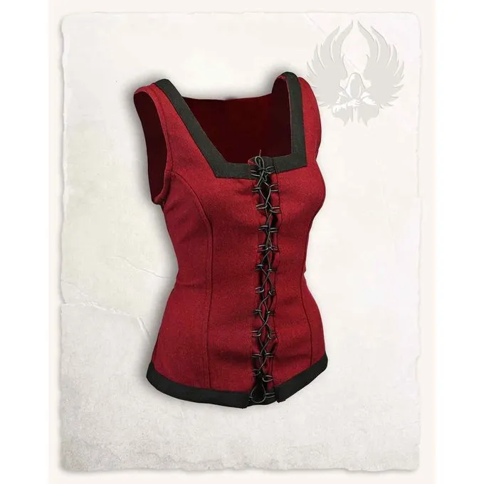 Porté sur un sous-vêtement ou une robe, le corsage « Ursula » se réchauffe les jours frais et protège contre les pluies légères. Utilisé vaguement sous forme de gilet ou étroitement lacé et fermé avec le laçage sur le devant, le corsage peut être amené dans la forme souhaitée.