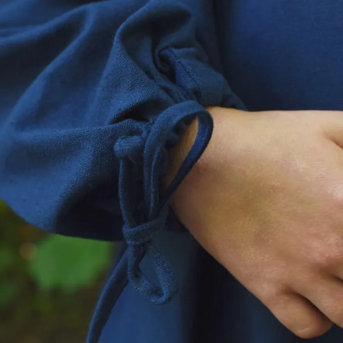 Robes comme celle-ci ont été portés au Moyen Age comme un underdress pendant les mois les plus froids, ou comme une robe régulière en été. Les manches et le cou ont des cordes pour ajuster la robe à votre taille. Avec ces cordons, vous pouvez également créer un effet de manche bouffante de la lumière. Vous pouvez porter la robe séparément ou sous une autre robe de couleur ou le combiner avec un tablier. Pour déterminer la taille, mesurer la hauteur du corps de l’enfant. Avec une hauteur de corps de 128 cm, la taille 128 est la meilleure option.