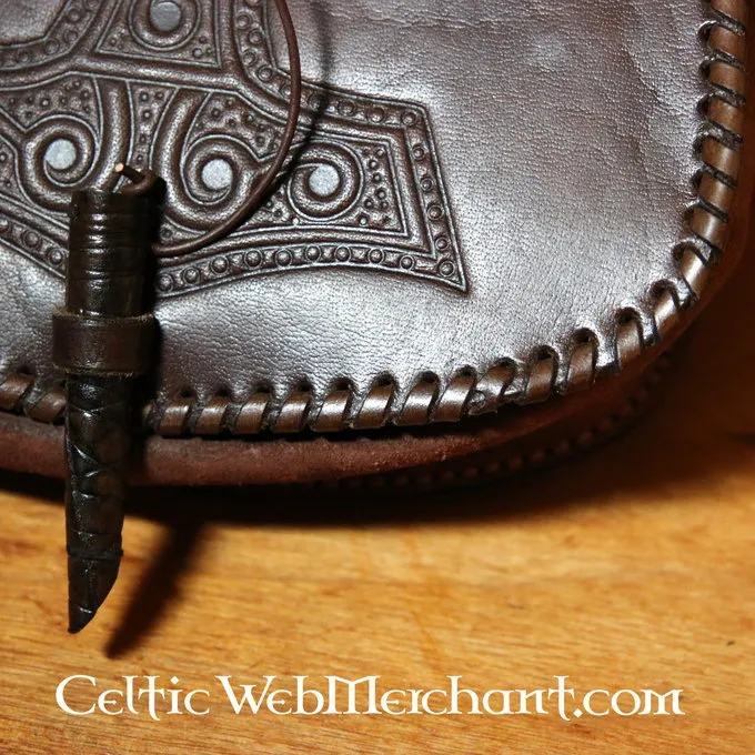 Ce sac est élégamment décoré avec une empreinte de Mjolnir, le marteau du Thor. Le sac peut être accroché à une ceinture avec les deux boucles et peut être fermé par un morceau de cuir torsadé.