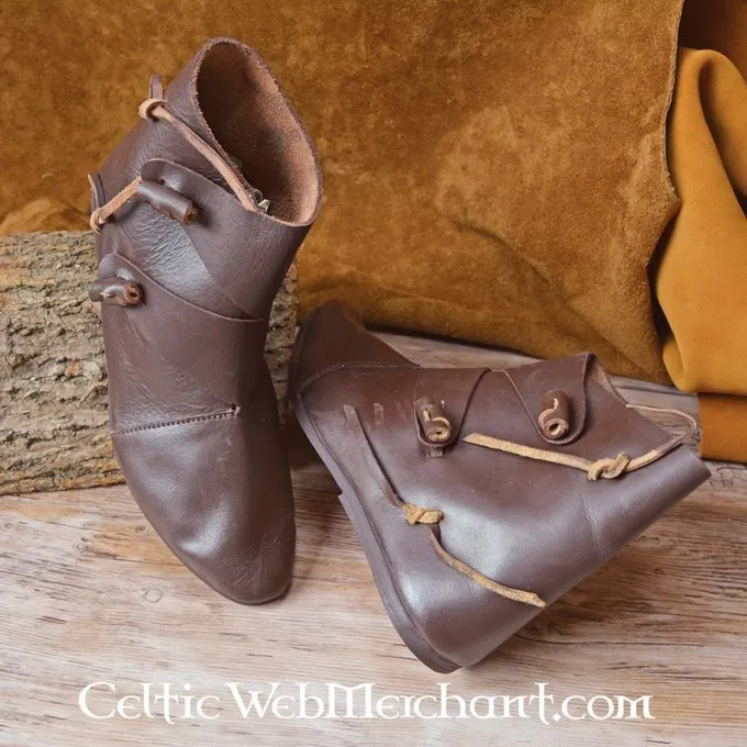 Ces chaussures Viking sont basées sur des originaux qui ont été fouillés dans la ville viking de Jorvik. Les chaussures sont en cuir de vachette de 2 mm d’épaisseur. Ils ont des semelles en cuir de 5 à 6 mm d’épaisseur et sont disponibles dans les tailles 40 à 47.