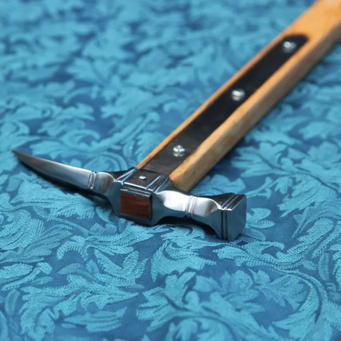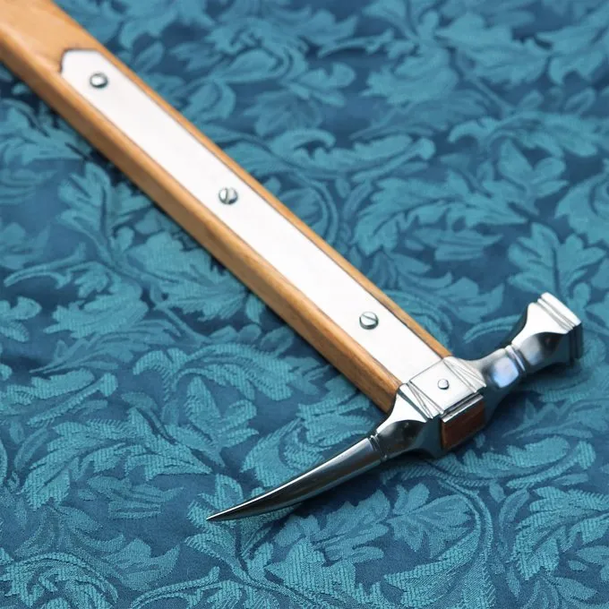 Matériel: 1065 acier au carbone, cuir, bois / Astuce: entre semi-pointu et émoussé. Facile à émousser pour reconstitution historique / Longueur: 63,2 cm / Longueur hammerhead: 16 cm / Longueur de poignée: 23,3 cm / Point d’équilibre: 21 cm sous hammerhead